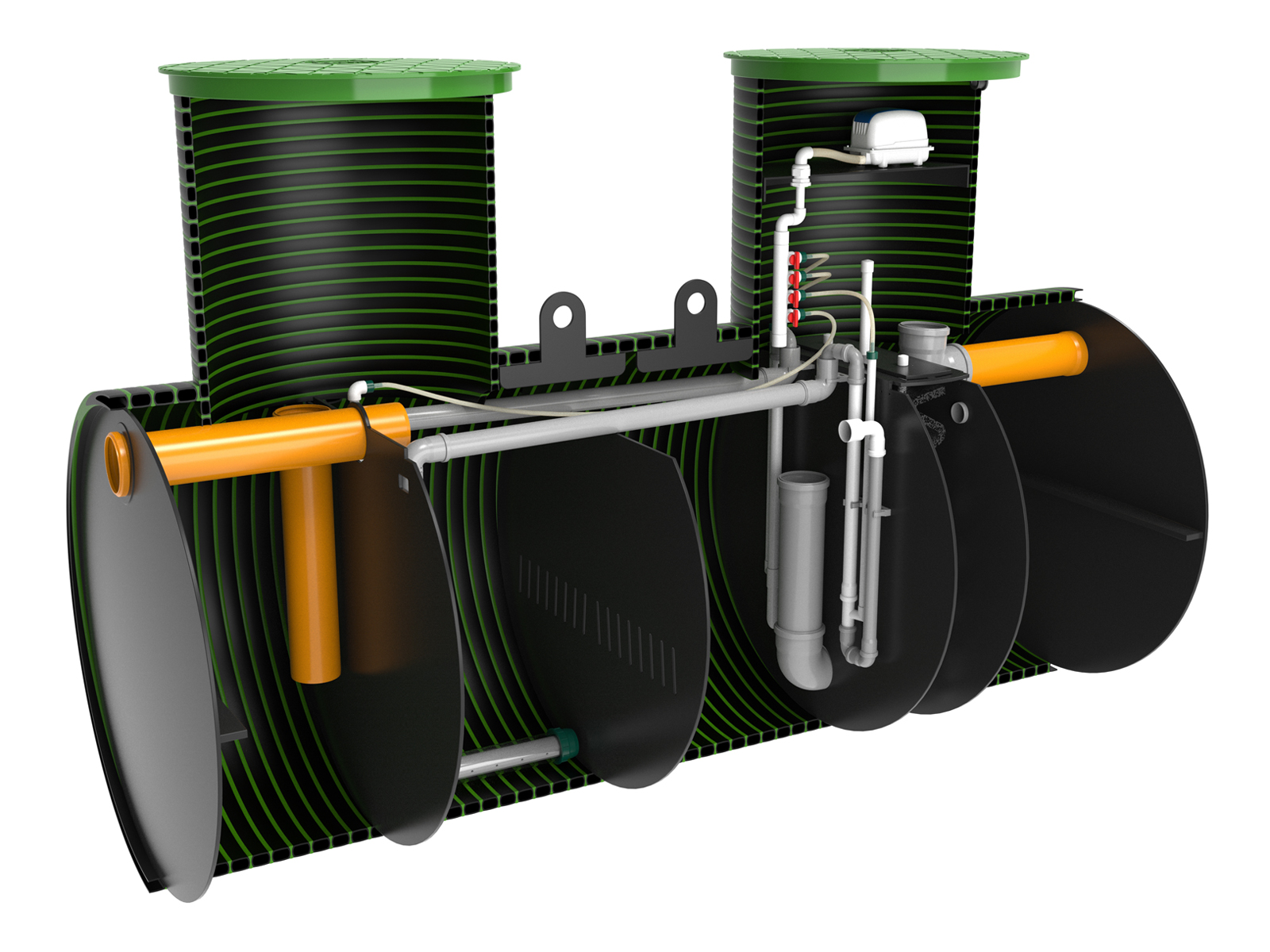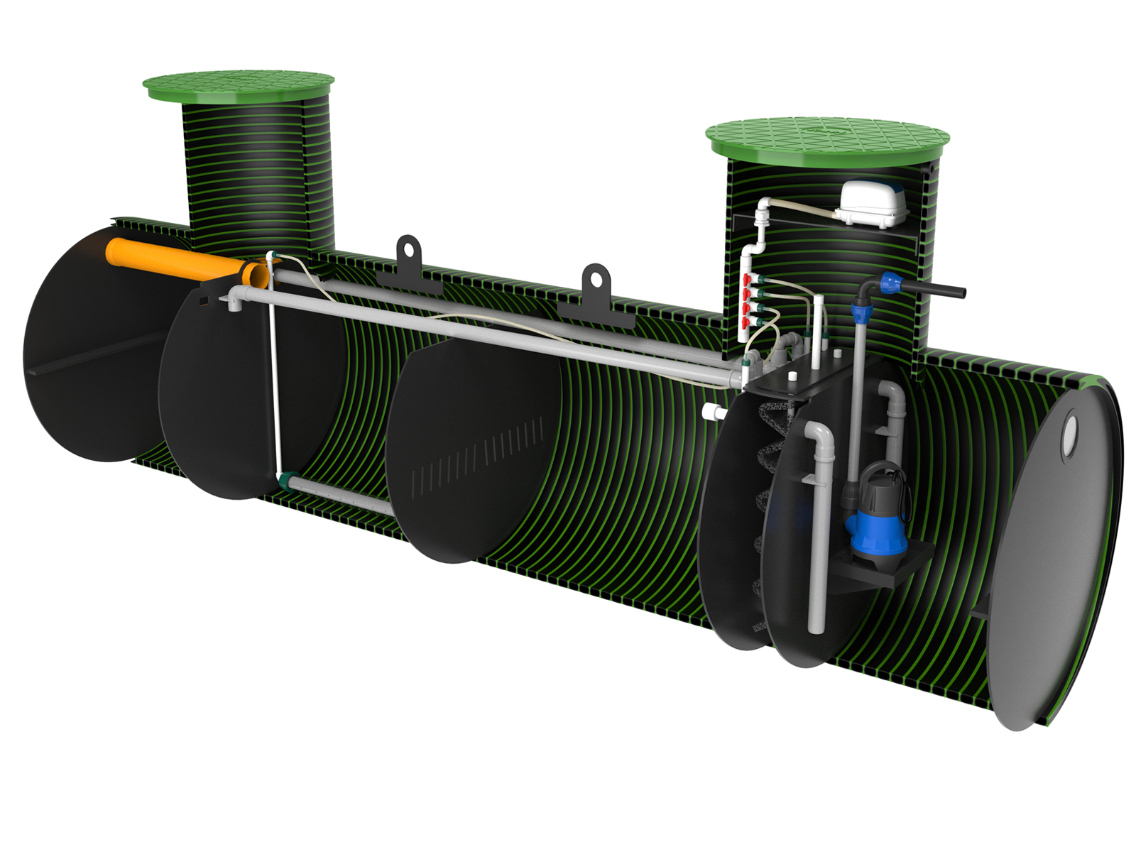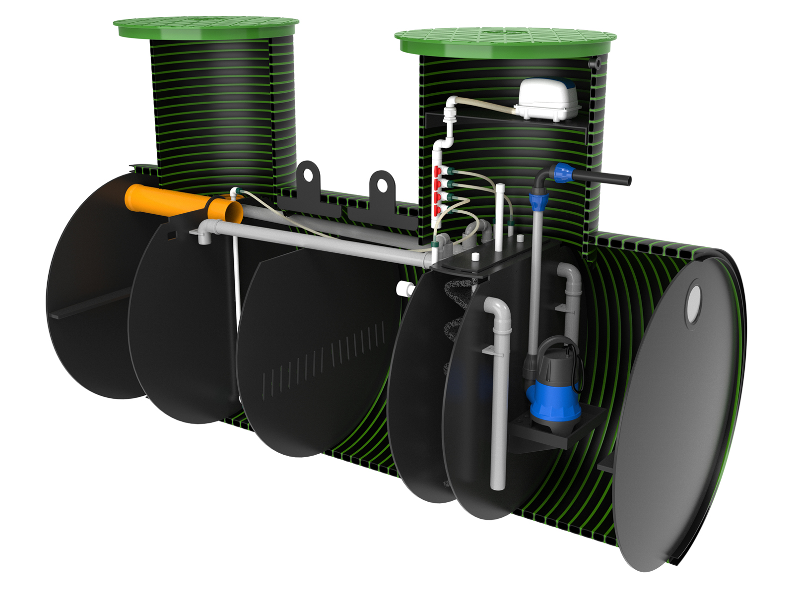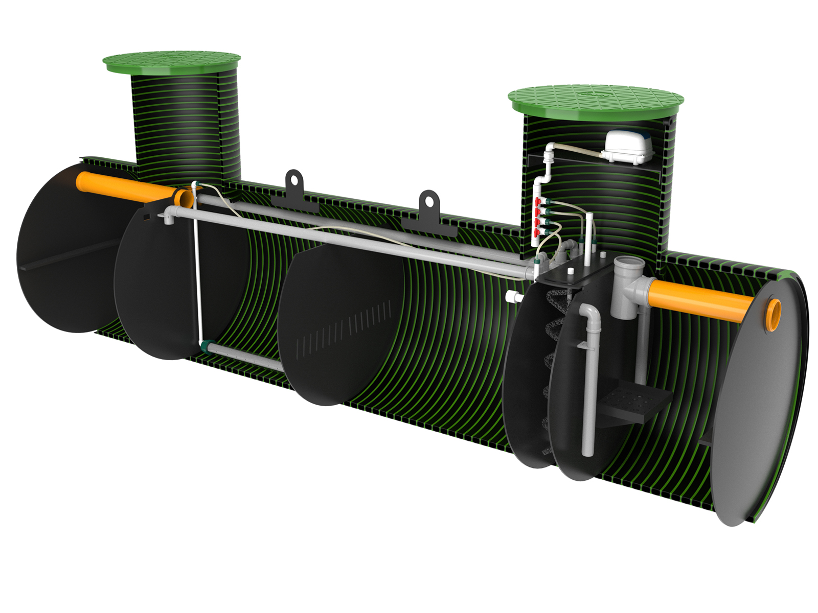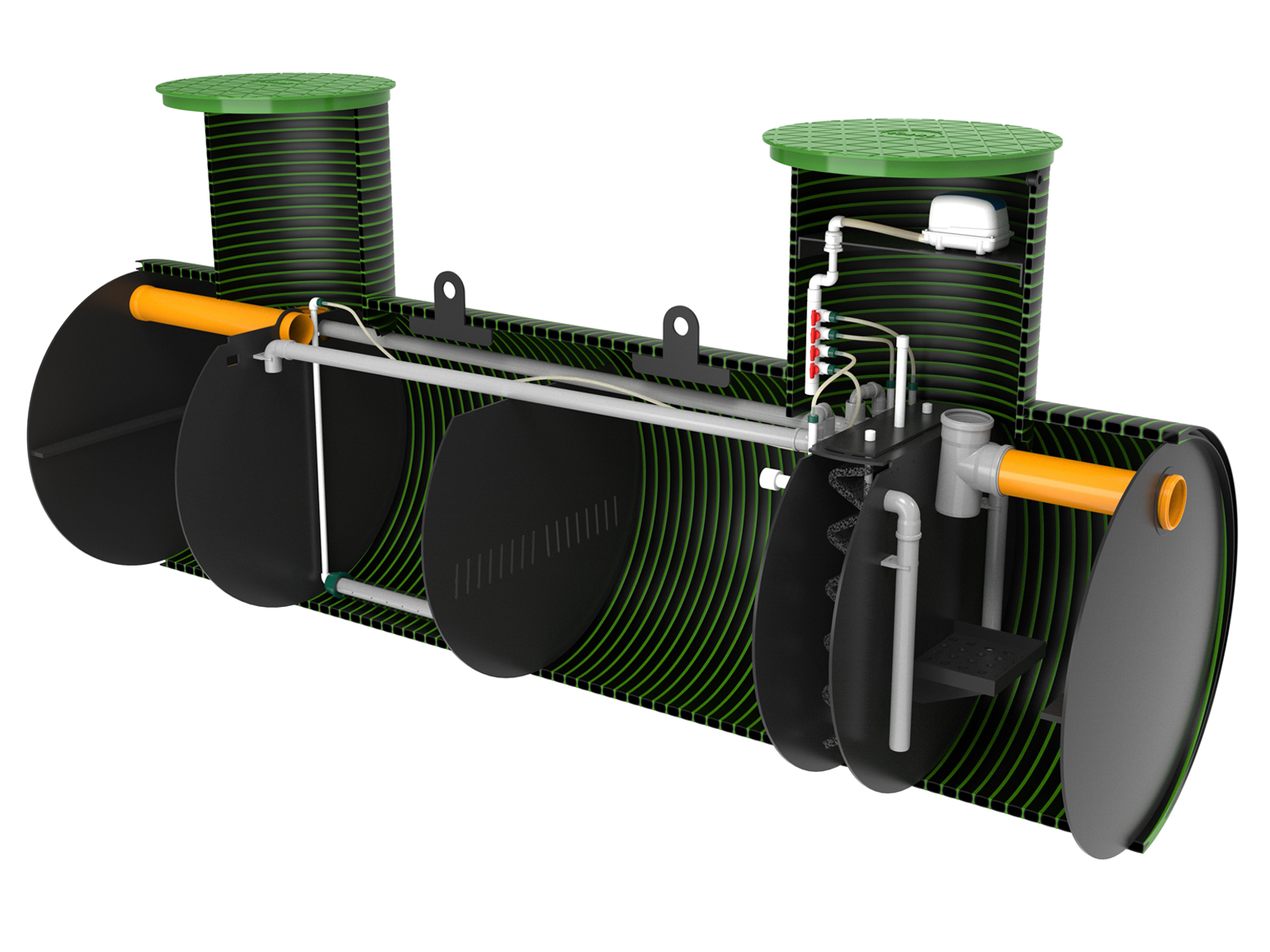 Станция KANN серии ULTRA подходит как для постоянного проживания, так и для сезонного (дачный вариант). Все конструктивные элементы и детали станций серии ULTRA, контактирующие со сточными водами, выполнены из коррозионностойких полимеров. Обслуживание станции заключается в периодической откачке избыточного ила. Откачка производится при помощи дренажного насоса (погружается через люк обслуживания) или при помощи илососной машины.